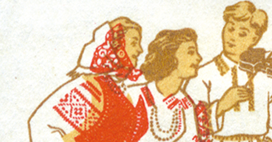 Болгары в национальных костюмах, флаг и герб Болгарии.